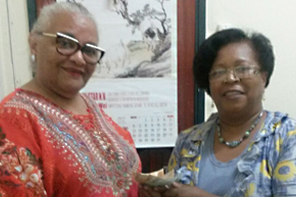 Overdracht van €100,- voor het project Ondersteuning Rolstoel door mevrouw Jennifer van Genderen (PR) van de Olton Willem van Genderen Stichting in Suriname aan de directeur van de stichting Het Blauwe Nest mevrouw Lydia Burleson.